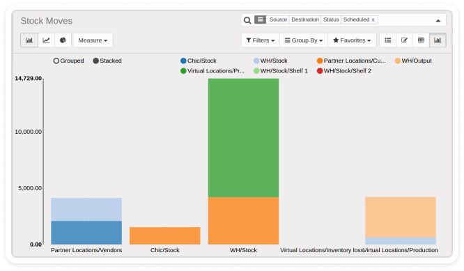 This principle enables you to track products without gaps. The chain is not only limited to your storage area, but can also be traced to the movements of customers or suppliers. Furthermore Odoo offers you the possibility to create extended reports. The complete functions are available via the intuitive user interface.